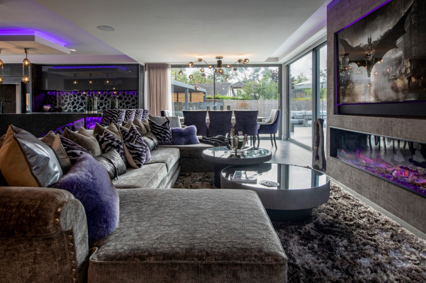Metalised cork wall-covering and layered window treatments has brought the living area to life, with the use of soft textured rugs and bespoke upholstery to create a cosy family lounging area and entertainment space. The feature sideboard was designed using wood veneers - book matched for maximum effect, with marble top and black nickel detailing. This, along with the faux concrete dining table are both stylish and practical for everyday usage.